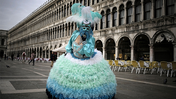 2月12日,威尼斯嘉年華化妝游行在意大利威尼斯大運河上隆重舉行。