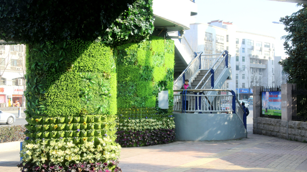安徽省合肥市一處過街人行天橋橋墩根部安裝了長勢正好的多色綠植,使整個橋墩變得生機盎然。