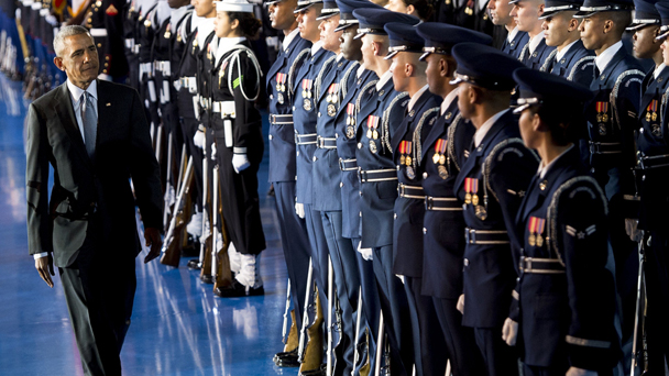 當地時間2017年1月4日,美國總統奧巴馬的榮譽告別儀式在弗吉尼亞州海德森·霍爾聯合基地舉行,奧巴馬全程頻繁抿嘴神情凝重。