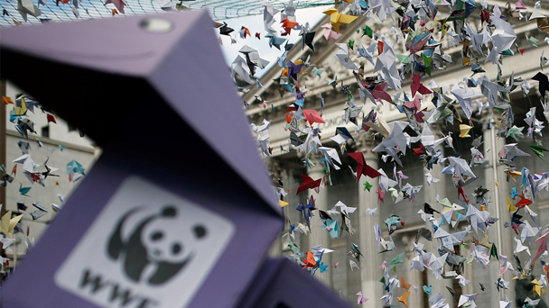11月24日,世界自然基金會(WWF)在西班牙馬德里議會外放置數(shù)千只紙鶴,呼吁當?shù)卣Wo科托多尼亞納國家公園。