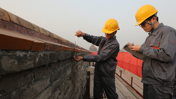 2016年11月26日,準備進行修繕的故宮城墻旁搭起腳手架。