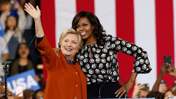 當時間10月27日,美國民主黨總統候選人希拉里·克林頓在北卡羅來納州溫斯頓-塞勒姆舉行競選集會,第一夫人米歇爾·奧巴馬前來助陣。兩人相擁在一起,同臺秀親密。