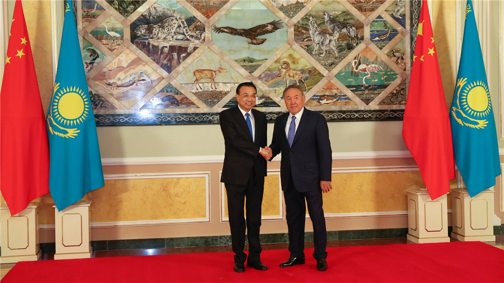 國務院總理李克強當地時間3日晚在阿斯塔納總統府會見哈薩克斯坦總統納扎爾巴耶夫。
