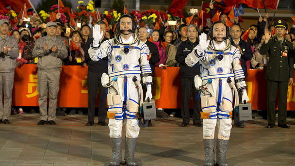 2016年10月17日4時(shí)40分,神舟十一號(hào)航天員出征儀式在酒泉衛(wèi)星發(fā)射中心圓夢(mèng)園廣場(chǎng)舉行。神舟十一號(hào)載人飛船定于10月17日7時(shí)30分發(fā)射。