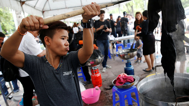當(dāng)?shù)貢r(shí)間2016年10月17日,泰國(guó)曼谷,志愿者在泰國(guó)大皇宮外提供漂染黑衣服務(wù)。