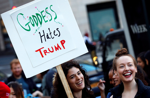 美國(guó)紐約當(dāng)?shù)貢r(shí)間2016年10月18日,大批民眾聚集到特朗普大廈外面,抗議美國(guó)共和黨候選人特朗普。