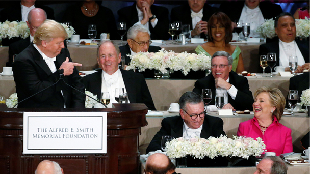 10月20日晚,美國(guó)總統(tǒng)大選候選人希拉里和特朗普共同出席一場(chǎng)慈善晚宴,同坐一桌,互相挖苦調(diào)侃。