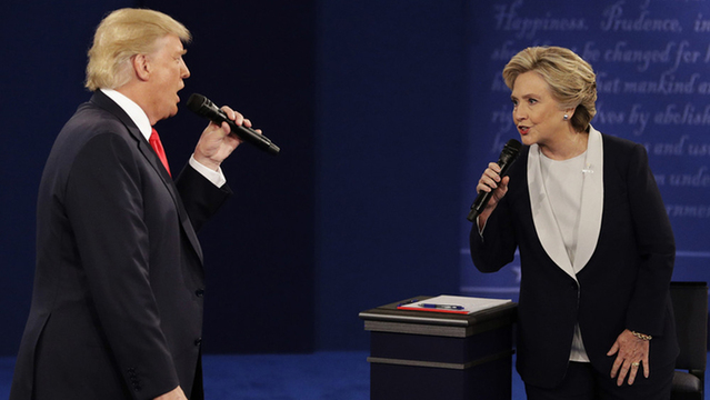 10月9日,在美國(guó)密蘇里州圣路易斯市的華盛頓大學(xué),美國(guó)共和黨總統(tǒng)候選人唐納德·特朗普和民主黨總統(tǒng)候選人希拉里·克林頓參加了2016年美國(guó)總統(tǒng)候選人第二場(chǎng)電視辯論。此次辯論火藥味升級(jí),兩人開場(chǎng)就未握手。