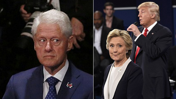 當(dāng)?shù)貢r(shí)間10月9日,在2016年美國(guó)總統(tǒng)候選人第二場(chǎng)電視辯論上,特朗普重提希拉里的丈夫、前總統(tǒng)比爾·克林頓的性侵丑聞,坐在觀眾席的克林頓表情嚴(yán)肅,眼神極具“殺傷力”。