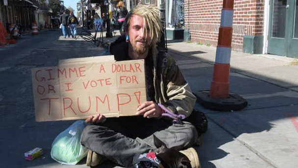 近日,紐約時(shí)報(bào)廣場(chǎng)附近一名無家可歸者打出一張標(biāo)語,吸引了不少行人駐足,上面寫著:給我一美元,否則我就投票給特朗普。