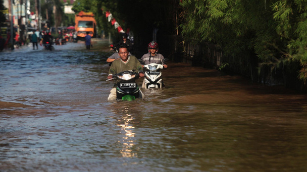 當(dāng)?shù)貢r(shí)間8月20日,印尼首都雅加達(dá)遭遇暴雨后引發(fā)洪水,街道被淹沒(méi),民眾出行成難題。