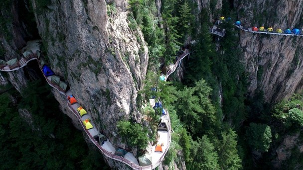 據了解,當日是老君山2016露營節開幕首日,眾多“驢友”于頭天晚上在懸空棧道上安營扎寨,美夢于云端之上,體驗野外別樣樂趣。