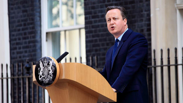 英國當(dāng)?shù)貢r間6月24日上午,在脫歐公投結(jié)果公布1個多小時后,英國首相卡梅倫在唐寧街10號首相官邸前發(fā)表召開發(fā)布會,宣布將辭去英國首相一職,英國保守黨將在今年10月選出新任首相。