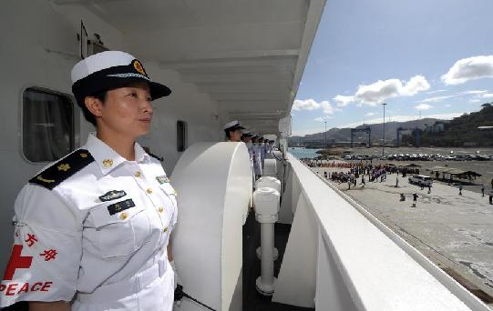 7月11日,在巴布亞新幾內(nèi)亞首都莫爾茲比港,中國(guó)海軍和平方舟醫(yī)院船的醫(yī)護(hù)人員在甲板列隊(duì)站坡。新華社發(fā)(江山攝) 7月11日,在巴布亞新幾內(nèi)亞首都莫爾茲比港,當(dāng)?shù)孛癖娞饌鹘y(tǒng)舞蹈,歡迎中國(guó)海軍和平方舟醫(yī)院船。