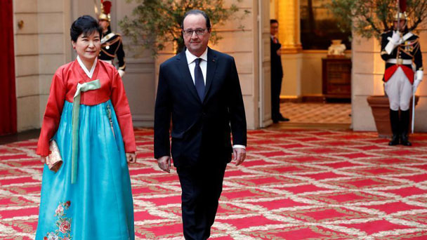 6月3日,法國巴黎,法國總統奧朗德在愛麗舍宮舉行的國宴招待來訪的韓國總統樸槿惠,樸槿惠身穿傳統韓服出席。