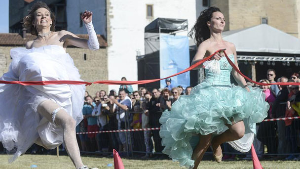 6月4日,在愛沙尼亞納爾瓦,裝扮成新娘的女子參加“國際新娘賽跑”。當日,愛沙尼亞第三大城市納爾瓦舉行“國際新娘賽跑”,來自愛沙尼亞、俄羅斯和拉脫維亞的約70名女子裝扮成新娘,進行50米賽跑,爭奪鉆戒大獎。