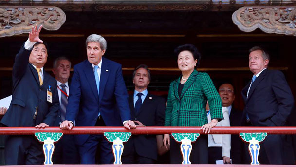 6月5日,國務院副總理劉延東在北京與美國國務卿克里共同考察了由故宮和美國世界建筑文物保護基金會合作進行的故宮乾隆花園修復工程。