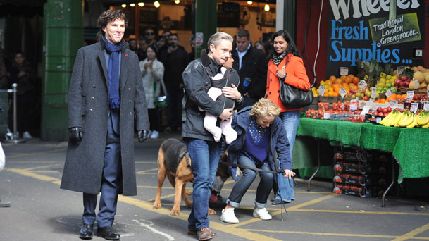 當(dāng)?shù)貢r(shí)間2016年4月26日,英國(guó)倫敦,《神探夏洛克4》熱拍中,華生馬丁-弗里曼(Martin Freeman)變身奶爸胸前抱著孩子,而他現(xiàn)實(shí)生活中的女友也同框亮相搭戲.