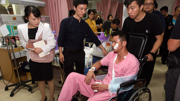 7月7日凌晨,在泰國普吉島,翻船事故幸存者林宏政(左)在病房照顧受傷的同學。當地時間5日17時45分左右,兩艘游船在泰國普吉島附近海域突遇特大暴風雨,發生傾覆并沉沒。當地時間5日17時45分左右,兩艘游船在泰國普吉島附近海域突遇特大暴風雨,發生傾覆并沉沒。