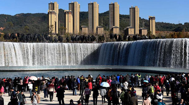 1月2日,游人在新建成的昆明瀑布公園參觀游覽。公園的瀑布景觀區充分利用牛欄江引水入滇工程而形成人工瀑布及湖泊,其利用約12.5米的地勢高差,建設成寬幅約400米的人工瀑布。新華社記者藺以光 攝 近日,位于云南省昆明市北部山水新區的昆明瀑布公園建設完工并免費向市民開放。