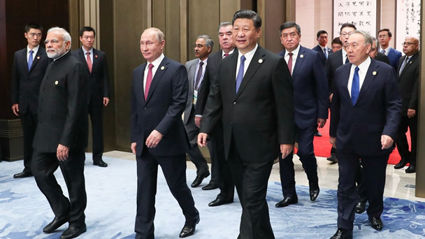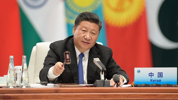 上海合作組織成員國領導人10日共同會見記者。國家主席習近平作為主席國元首發表講話。印度總理莫迪、哈薩克斯坦總統納扎爾巴耶夫、吉爾吉斯斯坦總統熱恩別科夫、巴基斯坦總統侯賽因、俄羅斯總統普京、塔吉克斯坦總統拉赫蒙、烏茲別克斯坦總統米爾濟約耶夫出席。