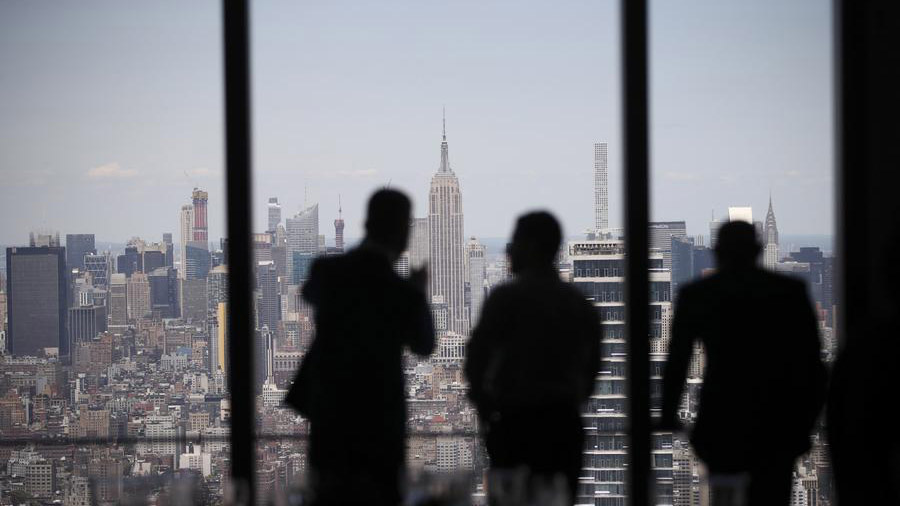 6月11日,在美國紐約曼哈頓,西爾維斯坦公司主席拉里·西爾維斯坦(前右一)在世貿中心三號樓啟用儀式上致辭。