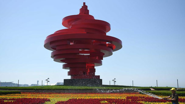 這是在青島市市南區東海路拍攝的沿街景觀(5月31日攝)。隨著上合組織青島峰會的臨近,青島市主城區道路兩側張燈結彩,五彩繽紛的花卉、綠植景觀營造出濃郁的盛會氛圍,喜迎賓朋。