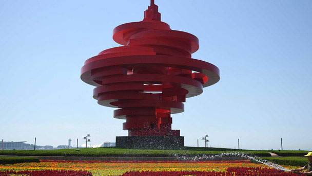這是在青島市市南區東海路拍攝的沿街景觀(5月31日攝)。隨著上合組織青島峰會的臨近,青島市主城區道路兩側張燈結彩,五彩繽紛的花卉、綠植景觀營造出濃郁的盛會氛圍,喜迎賓朋。