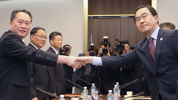 6月1日,在板門店韓方一側的“和平之家”,韓國統一部長官趙明均(右)與朝鮮祖國和平統一委員會委員長李善權握手。韓國和朝鮮6月1日在板門店韓方一側的“和平之家”舉行高級別會談,就履行《板門店宣言》的具體方案和后續措施達成一致。