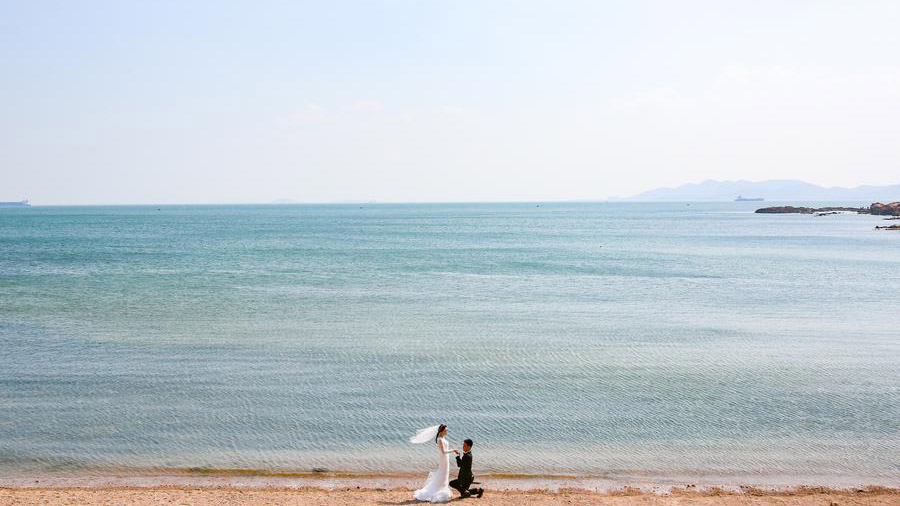 碧海藍天、紅瓦綠樹的青島吸引眾多情侶甜蜜留影,美麗的海濱城市洋溢著浪漫氣息。新華社記者 李紫恒 攝 一對情侶在青島第二海水浴場拍攝婚紗照(5月2日攝)。