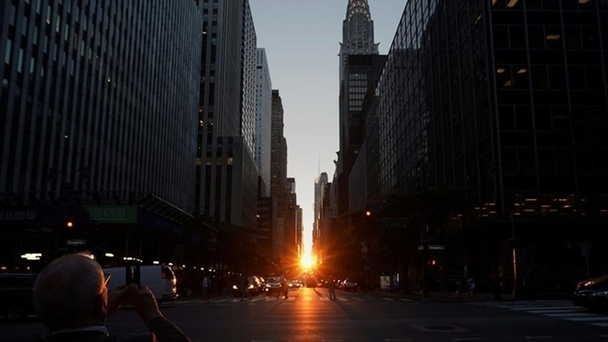 30日晚上,美國(guó)曼哈頓的街頭被停下來(lái)拍照的人們堵得水泄不通,人們都聚集在這里想要拍下落日余暉的美麗瞬間。