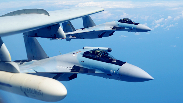 當(dāng)日,空軍新聞發(fā)言人申進(jìn)科在華南某機(jī)場(chǎng)發(fā)布消息,空軍于11日組織東部、南部戰(zhàn)區(qū)空軍協(xié)同行動(dòng),出動(dòng)轟炸機(jī)、偵察機(jī)雙向繞飛臺(tái)島巡航。