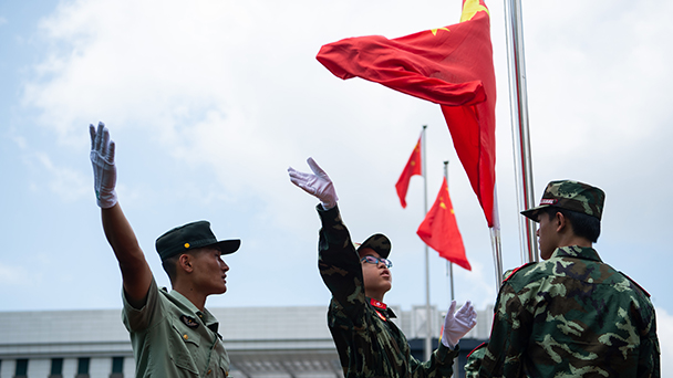 當(dāng)日,“國(guó)旗下的說(shuō)話·2018年澳門(mén)中學(xué)生國(guó)旗手訓(xùn)練營(yíng)”舉行。來(lái)自30所澳門(mén)中學(xué)的300余名中學(xué)生會(huì)聚解放軍駐澳門(mén)部隊(duì)氹仔軍營(yíng),在迷彩的青春方陣中親手升起鮮艷的五星紅旗。新華社記者張金加 攝