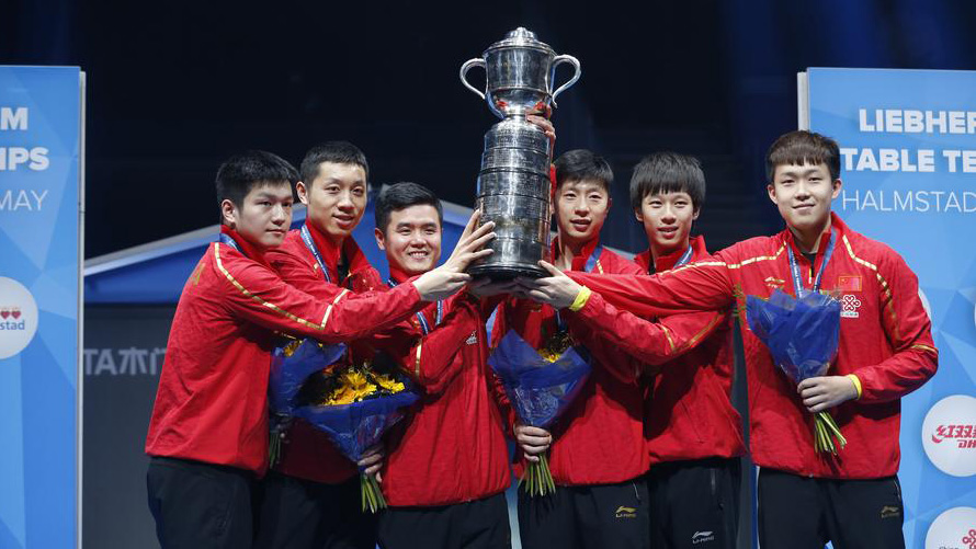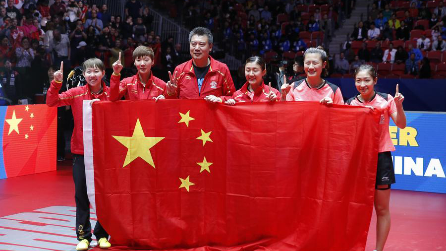 5月5日,中國(guó)隊(duì)隊(duì)員和教練李隼(左三)慶祝奪冠。當(dāng)日,在瑞典哈爾姆斯塔德舉行的2018年乒乓球世界團(tuán)體錦標(biāo)賽女團(tuán)決賽中,中國(guó)隊(duì)以3比1戰(zhàn)勝日本隊(duì),奪得冠軍。當(dāng)日,在瑞典哈爾姆斯塔德舉行的2018年乒乓球世界團(tuán)體錦標(biāo)賽女團(tuán)決賽中,中國(guó)隊(duì)以3比1戰(zhàn)勝日本隊(duì),奪得冠軍。