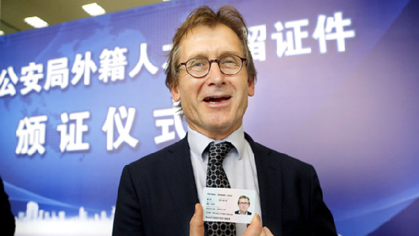 5月2日,諾貝爾獎(jiǎng)得主伯納德·費(fèi)林加在展示領(lǐng)取的永久居留身份證。當(dāng)日,上海為伯納德·費(fèi)林加等7名外籍人士頒發(fā)外國(guó)人永久居留身份證和居留許可,這將給他們出入境、在華生活和工作帶來(lái)諸多便利。