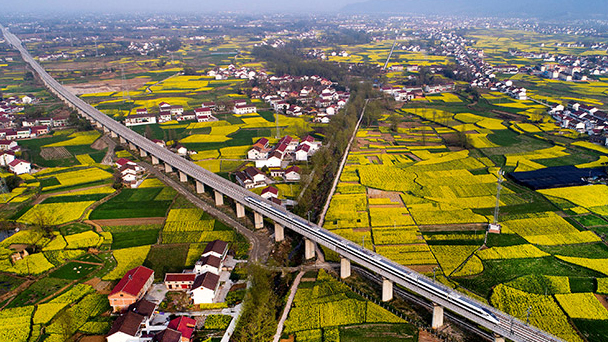 3月21日,一列動車正通過陜西省漢中市南鄭縣新集鎮油菜花海(無人機拍攝)。新華社記者 胡虎虎 攝 3月24日,河北省靈壽縣南營鄉車谷砣村黨支部書記陳春芳介紹他帶領村民開辦農家樂脫貧的情況。
