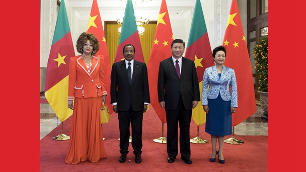 3月22日,國家主席習近平在北京人民大會堂同喀麥隆總統比亞舉行會談。這是習近平和夫人彭麗媛同比亞夫婦合影。