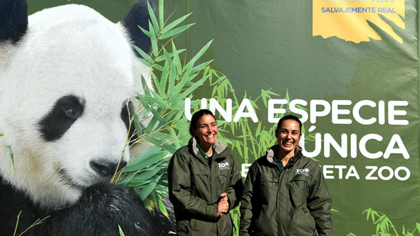 3月22日,在西班牙馬德里動物園,飼養員瑞貝卡(右)和艾斯特法妮雅站在大熊貓宣傳畫前。新華社記者郭求達攝 3月22日,在西班牙馬德里動物園,飼養員瑞貝卡(左)和艾斯特法妮雅站在遠處觀看大熊貓“冰星”活動。
