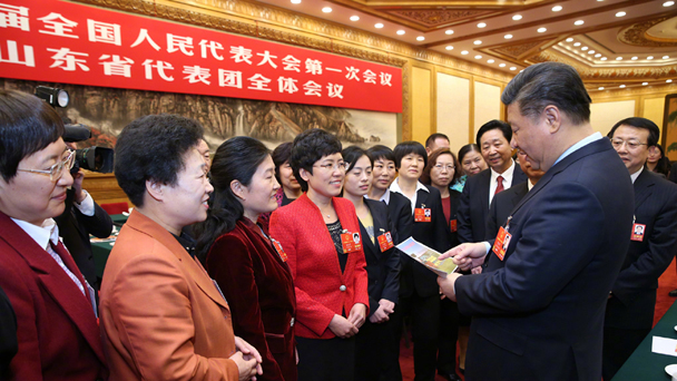 8日上午,習(xí)近平到山東代表團(tuán)參加審議。正值“三八”國(guó)際勞動(dòng)?jì)D女節(jié),習(xí)近平代表黨中央向女代表、女委員、女工作人員及全國(guó)各族各界婦女同胞,致以節(jié)日的祝賀和誠(chéng)摯的祝福。