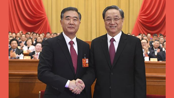 3月14日,全國(guó)政協(xié)十三屆一次會(huì)議在北京人民大會(huì)堂舉行第四次全體會(huì)議,選舉政協(xié)第十三屆全國(guó)委員會(huì)主席、副主席、秘書(shū)長(zhǎng)和常務(wù)委員。當(dāng)會(huì)議主持人宣布汪洋當(dāng)選政協(xié)第十三屆全國(guó)委員會(huì)主席后,俞正聲與汪洋熱烈握手,表示祝賀。
