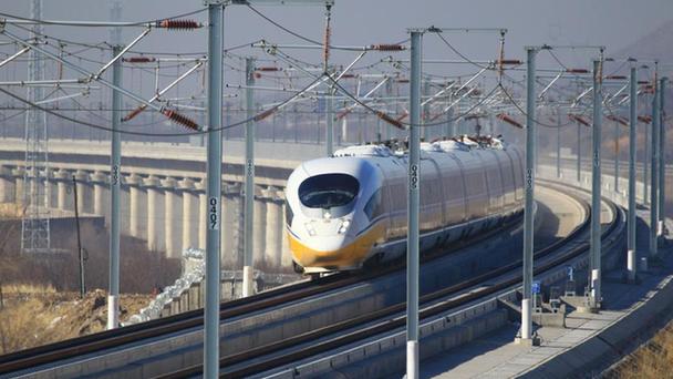 2018年3月16日,京沈高鐵遼寧段聯(lián)調(diào)聯(lián)試高速綜合檢測(cè)列車(chē)在朝陽(yáng)市快速駛過(guò)。京沈高鐵起自北京星火站,經(jīng)河北省承德市、遼寧省朝陽(yáng)市、阜新市接入沈陽(yáng)站,線路全長(zhǎng)698公里,設(shè)計(jì)時(shí)速350公里。