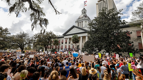 當?shù)貢r間2018年2月20日,美國佛羅里達州瑪喬麗·斯通曼·道格拉斯高中的學生和幸存者乘車前往州議會大廈,學生希望與議員們討論槍支管制改革。