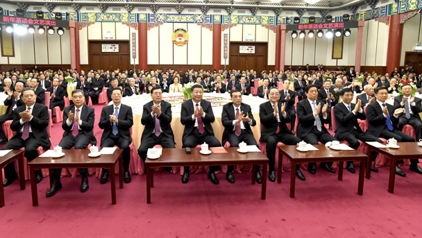 12月29日,全國政協(xié)在北京舉行新年茶話會。黨和國家領(lǐng)導人習近平、李克強、張德江、俞正聲、張高麗、栗戰(zhàn)書、汪洋、王滬寧、趙樂際、韓正出席茶話會并觀看演出。