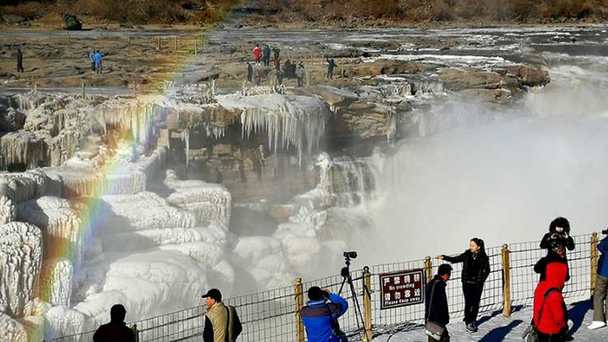 隨著氣溫持續(xù)下降,12月17日,位于晉陜大峽谷的黃河壺口瀑布形成獨(dú)特的“冰瀑玉壺”壯麗景觀。