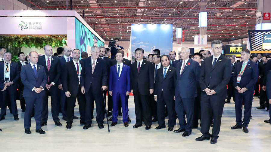 11月5日,國(guó)家主席習(xí)近平在上海同出席首屆中國(guó)國(guó)際進(jìn)口博覽會(huì)的外國(guó)領(lǐng)導(dǎo)人共同巡館。