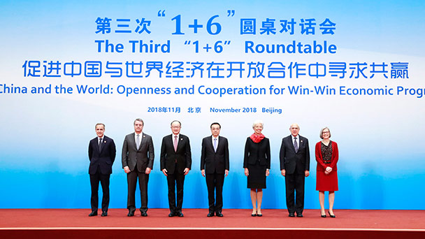 11月6日,國(guó)務(wù)院總理李克強(qiáng)在北京釣魚臺(tái)國(guó)賓館同世界銀行行長(zhǎng)金墉、國(guó)際貨幣基金組織總裁拉加德、世界貿(mào)易組織總干事阿澤維多、經(jīng)濟(jì)合作與發(fā)展組織秘書長(zhǎng)古里亞、金融穩(wěn)定理事會(huì)主席卡尼和國(guó)際勞工組織副總干事格林菲爾德舉行第三次“1+6”圓桌對(duì)話會(huì)。