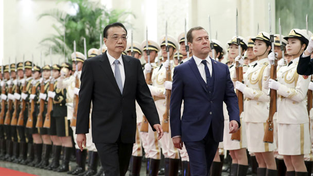 11月7日,國(guó)務(wù)院總理李克強(qiáng)在北京人民大會(huì)堂與俄羅斯總理梅德韋杰夫共同主持中俄總理第二十三次定期會(huì)晤。會(huì)晤前,李克強(qiáng)在人民大會(huì)堂北大廳為梅德韋杰夫舉行歡迎儀式。