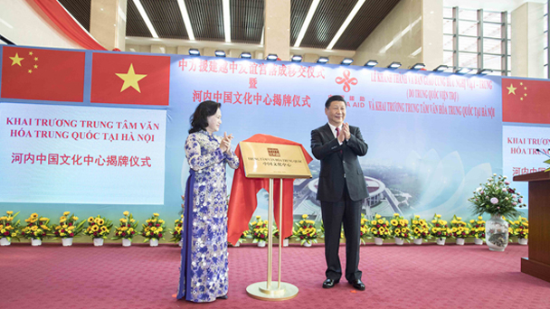 中共中央總書記、國家主席習(xí)近平12日在河內(nèi)出席越中友誼宮落成移交儀式暨河內(nèi)中國文化中心揭牌儀式。