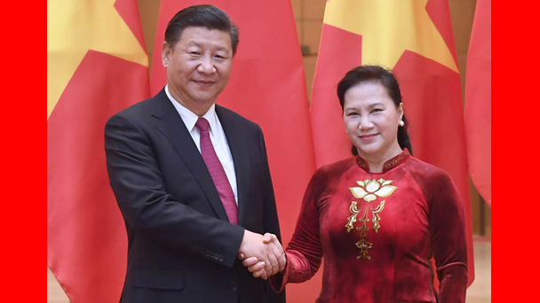 中共中央總書記、國家主席習(xí)近平12日在河內(nèi)會(huì)見越南國會(huì)主席阮氏金銀。
