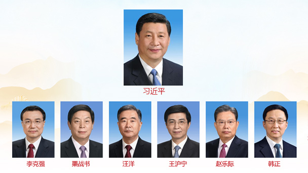 黨的十九屆一中全會(huì)選舉習(xí)近平、李克強(qiáng)、栗戰(zhàn)書(shū)、汪洋、王滬寧、趙樂(lè)際、韓正為中央政治局常委。
